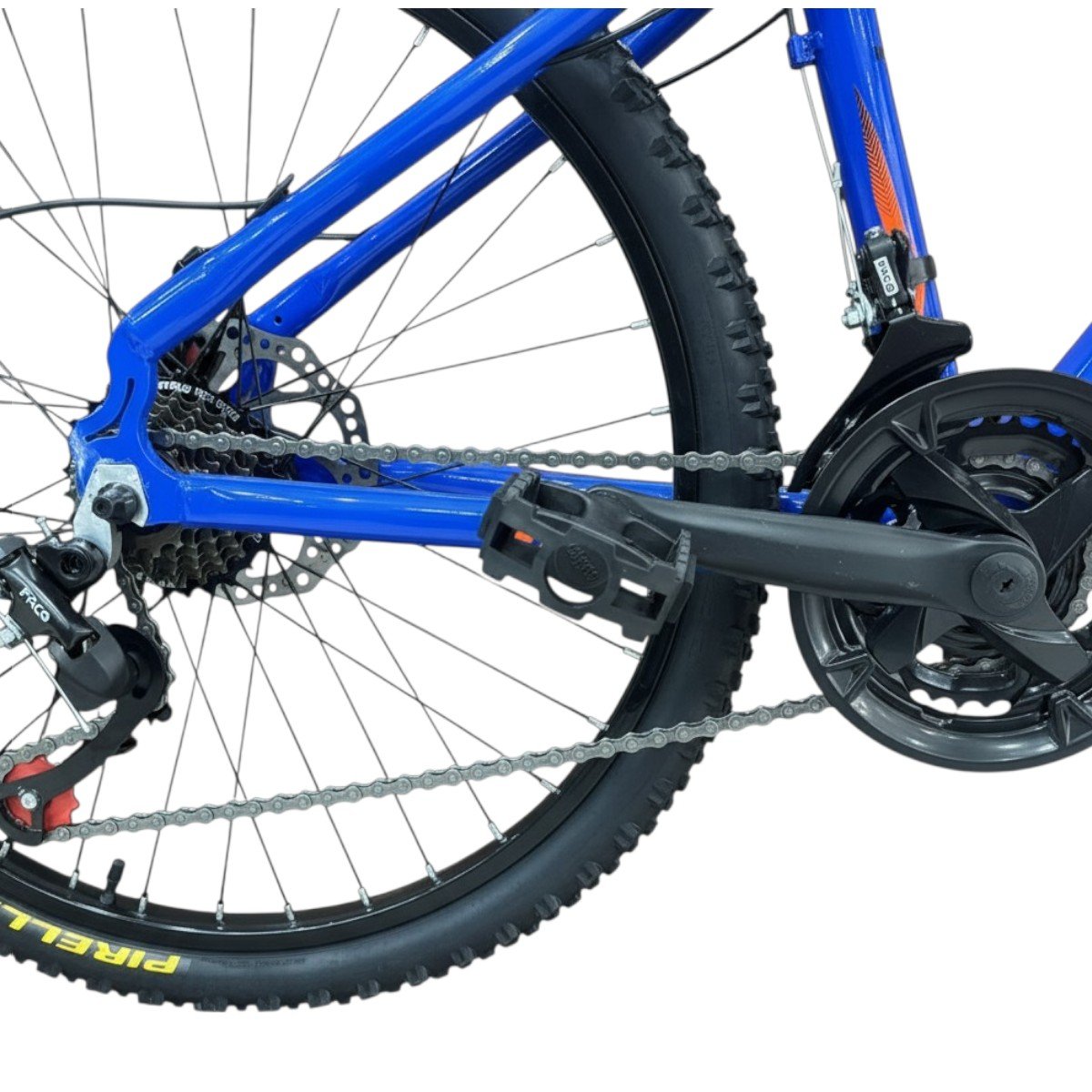 Seu quadro em alumínio proporciona leveza, resistência e durabilidade, enquanto o garfo com suspensão ajuda a absorver impactos, oferecendo mais conforto e controle. Equipada com freios a disco mecânicos, entrega frenagens mais seguras e eficientes, mesmo em condições adversas como chuva ou lama.