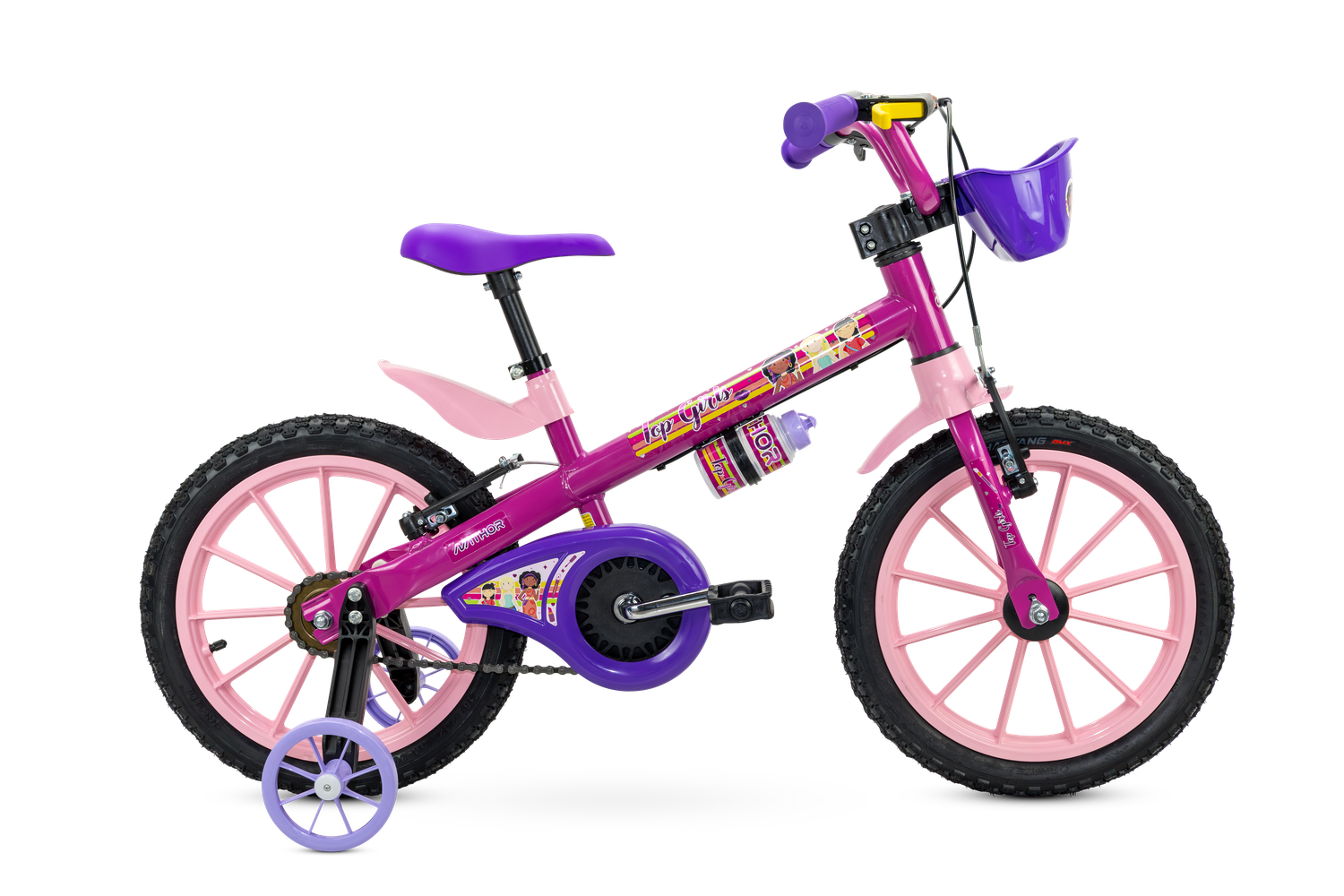 A aro 16” tem pneus com câmara, quadro em aço carbono e garrafinha.