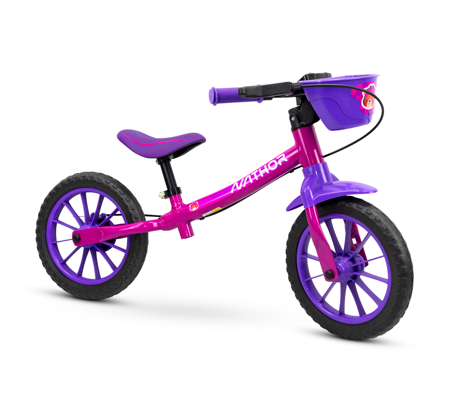 A bicicleta Balance Nathor conta com limitador de giro do guidão (garantindo mais segurança), pneus em E.V.A. (mais leves e antiderrapantes), freio traseiro a tambor e regulagem de altura do selim de PU.
